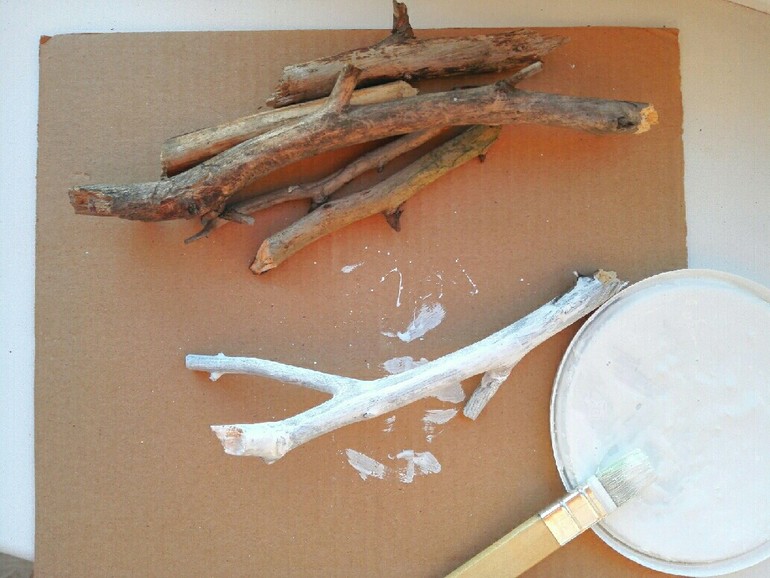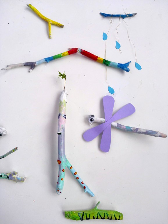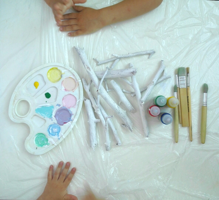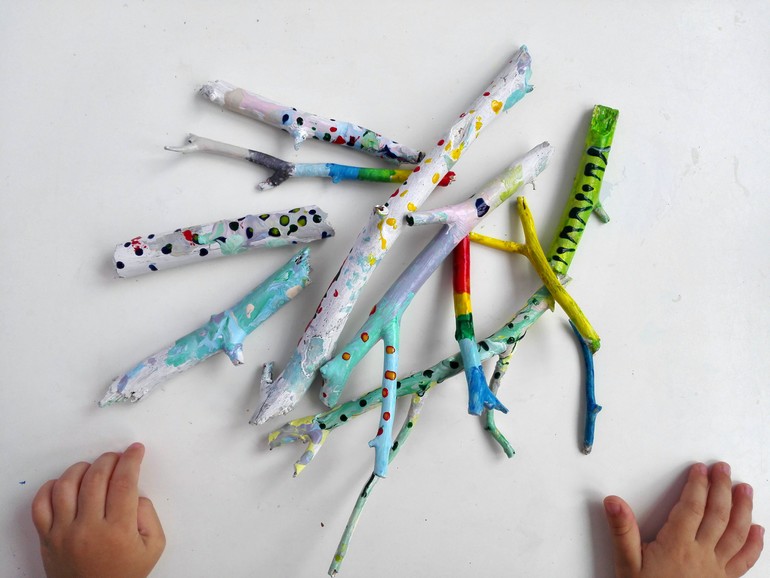 Мы семьей стараемся каждую неделю выбираться в лес на прогулку. О пользе таких прогулок можно говорить бесконечно. Самое ценное для меня, что мы можем побыть все вместе! Да да все вместе! Без телефона и интернета! В очередную нашу прогулку мы и насобирали палочки без коры. Дома я покрыла их белой краской, а потом выдала их вместе с разноцветными акриловыми красками дочкам. И вот что у нас вышло. Синяя палочка это тучка, желтая это солнышко ( ведь кто сказал что палка не может быть солнцем), зеленая это травка...