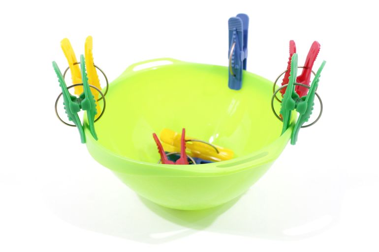 Малышам постарше можно предложить самостоятельно прицепить прищепки на край емкости.