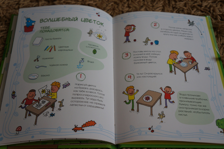Бонусом в книге есть два опыта. Один очень простой. показывает как вода питает корни и листья растений. Второй опыт сложнее и долгосрочнее. Нужно посадить семечко, поливать и ждать появления ростка.