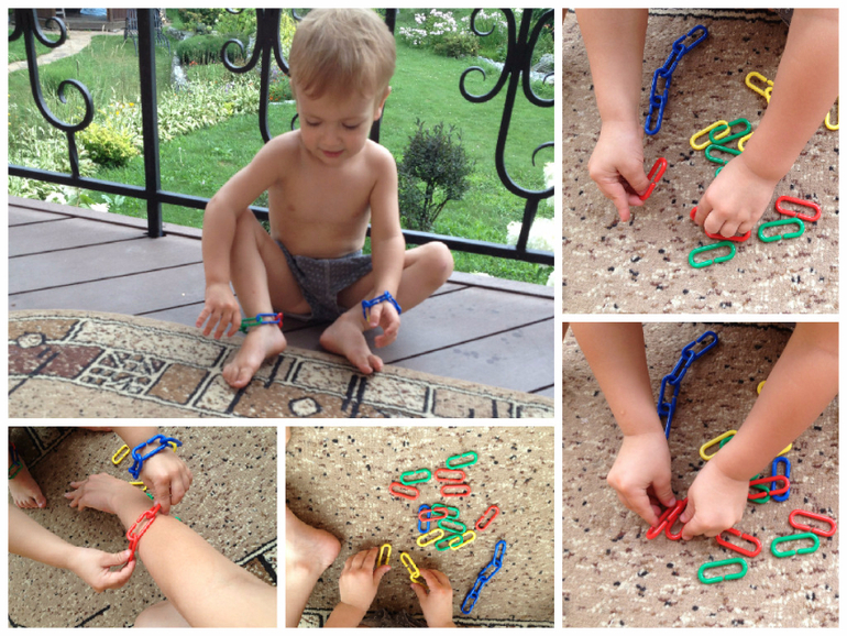 Со скрепками вообще смех, начали делать браслеты и для ног и для рук и на пояс ремень, еле как уговорила сына перед сном снять это добро, убегал от меня и говорил, что хочет поносить все это еще и еще, очень ему они понравились! даже не с первого раза уговорила его МНЕ сделать браслет на руку, хотел все себе только делать, потом сдался и сделал мне красивый браслет:-).