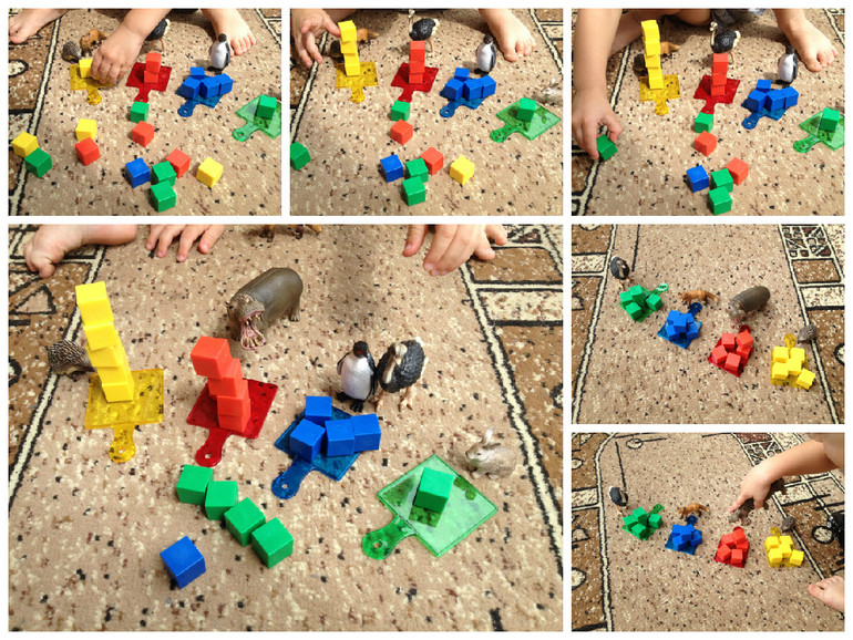 Ну как же без сортировки, у меня сын уже молча при виде цветных деталей начинает сортировать))) эти кубики классные, они я бы даже сказала тяжеленькие, очень приятно их брать в ладошку, они удивительно гладкие, внутри заполнены, пустоты нет, от этого и приятная тяжесть в ладошке, они необычные кубики, точно. Мы и строили башни/дороги с них, кормили ими животных, ну кубики - вы сами понимаете, что тут фантазия безгранична на использование кубиков...