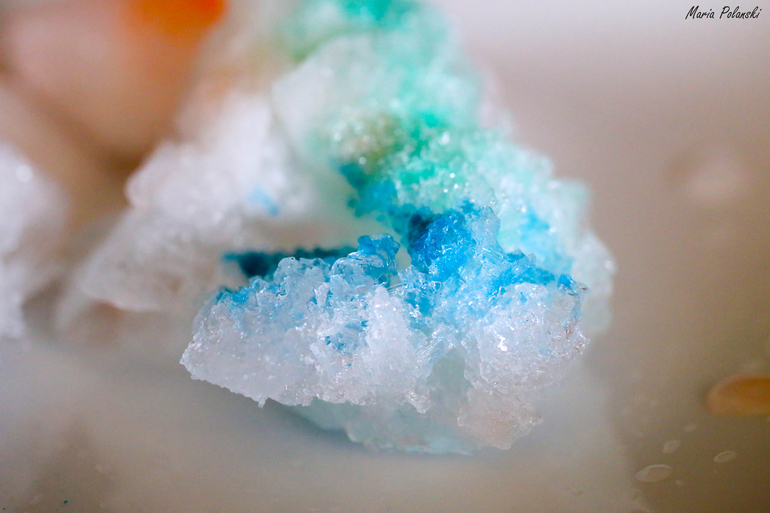 Если посмотреть на кусочек цветного льда на солнышке, то кажется, что это огромный драгоценный камень! Фотография конечно не передает, как лед сиял и как впечатляюще выглядели переливающиеся кристаллики!