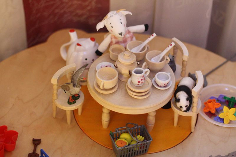 А вот у нас cамих уже была некоторая мебель- столы, стульчики, посуда, правда заказаны они были еще до знакомства с вальдорфской методикой, предполагающей минимальное копирование предметов, лишь тонкий намек. Например вот наша мебель (кстати здесь помимо котана и мебели еще запечатлен пряничный домик из икеа, который пользовался просто дикой, нет просто бешеной (!) популярностью в наших играх в возрасте от 1,5 лет и который складывается и может быть взят с собой в поездки и куда угодно).
