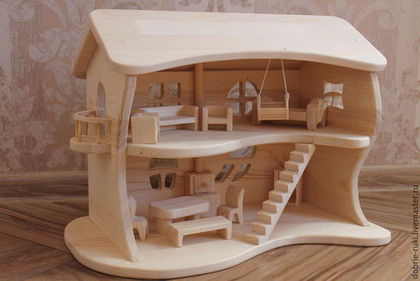 У Сергея я спросила, его ли это разработка, на что он ответил ,что выполнял по картинке заказчицы, дал мне ее контакт. Конечно, же заказчица была неравнодушна к Вальдорфской методике, она с удовольствием выслала мне фото дома в игровом состоянии. Игрушки-куколки она сделала своими руками, а вот откуда изначальное фото домика, вспомнить не смогла.