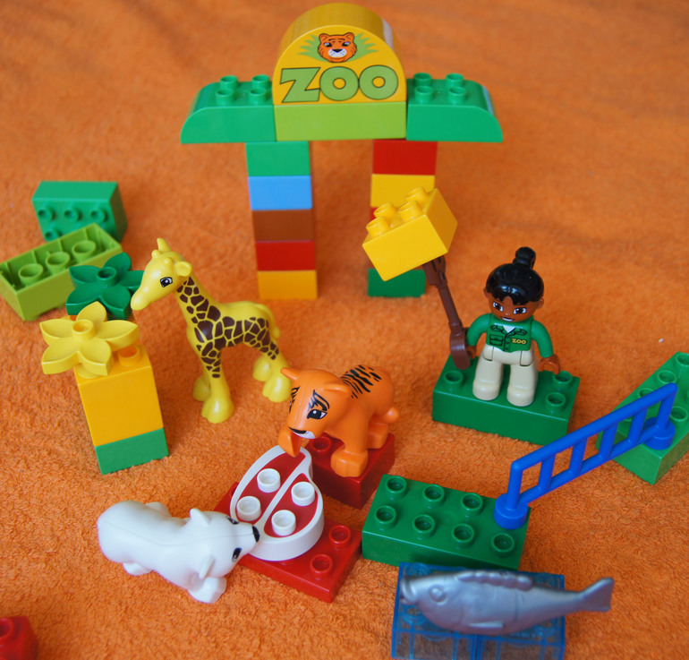 На данный момент мы играем так: я строю, дочка разбирает. Дочка сама пытается ( и у нее получается) прикрепить, например, льва на большую деталь. С маленькими сложнее. Я рассказываю мини-истории про животных. Показываю цвета. Главная роль этого конструктора в том, что иголочки стимулируют пальчики, а это ( мы помним) - прямая связь с развитием речи).