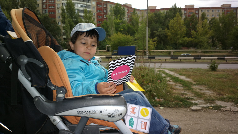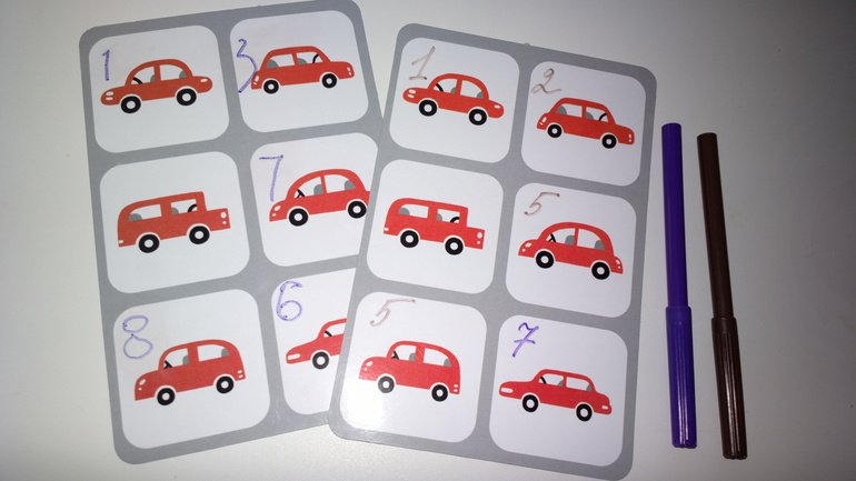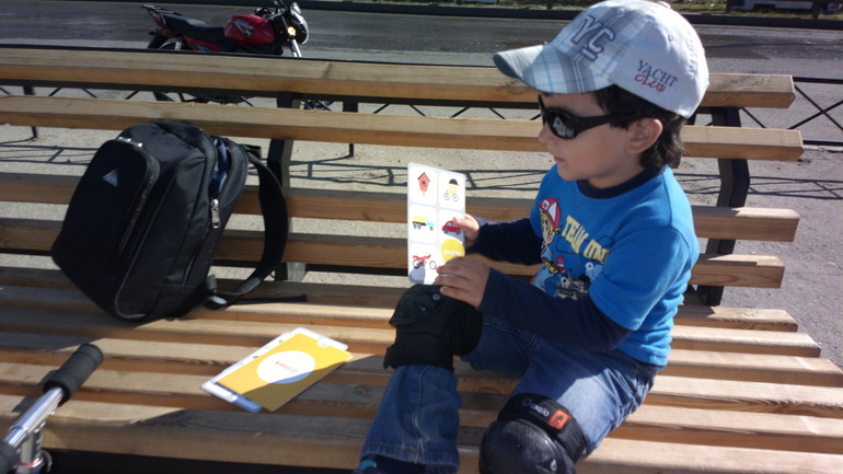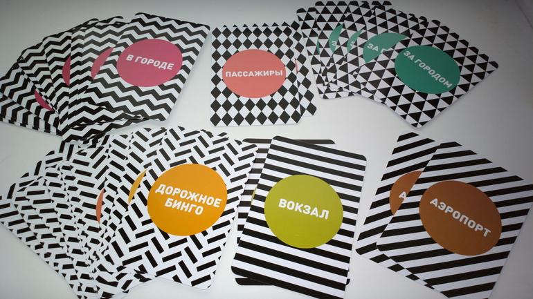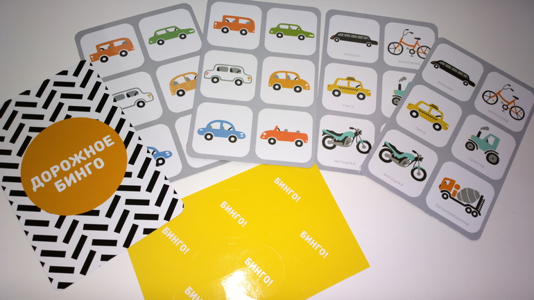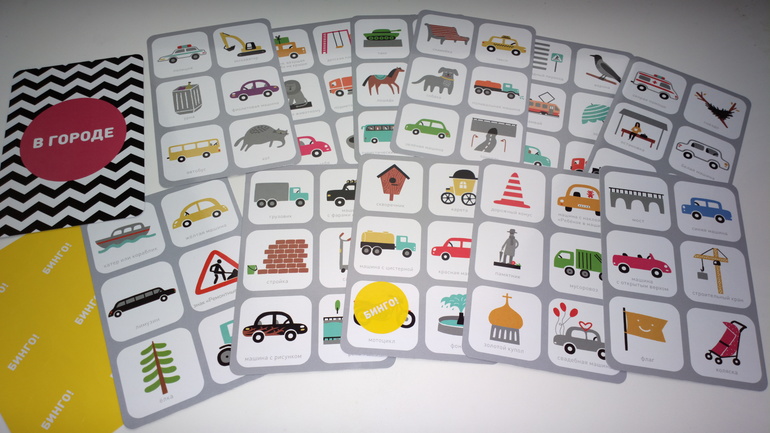 Если вы отправляетесь на прогулку, целесообразнее выбрать карточки из городской тематики ("В городе"+ карточки с транспортом "Дорожное бинго"), если поехали за город, то можно взять карточки с машинами + карточки "Вокзал", карточки "За городом"+ "Пассажиры". Вариантов много!