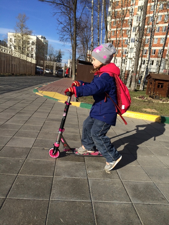 Прошлым летом мы катались на велосипеде со страховочными колесами. Этим летом катались на 2-колесом самокате