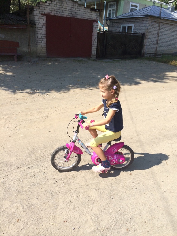 А приехали за ней на Кавказ (где она провела лето у бабушки с дедушкой), сняли ей 2 "лишних" колеса и.... через 5 минут она каталась сама!!! Счастью нашему и ее не было предела! Теперь каждый день проехать на велосипеде (а я за ней бегом следом) - это святое!