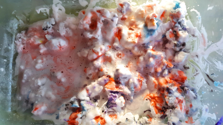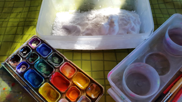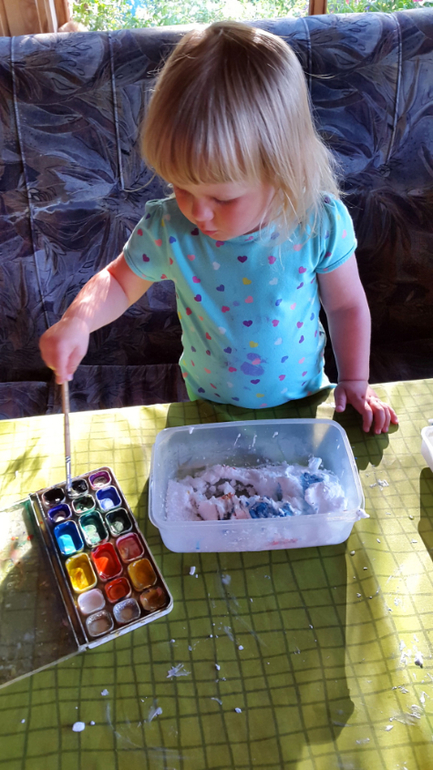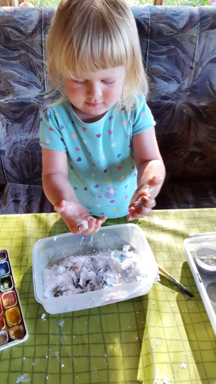 Художка ( красим, рисуем , придумываем новые способы рисовать)О да...я все про снег в разных вариациях...даже не знаю, почему так получается...Осталось у нас тут немного пены для бритья, я ее выдавила в миску и заморозила! Приятная получилась масса - холодная, мягкая, пористая, ароматная! Мы ее красили, мешали сначала ложкой, потом руками, потом топили ее водой! Много экспериментов и удовольствия, надо будет в следующий раз гору заморозить!