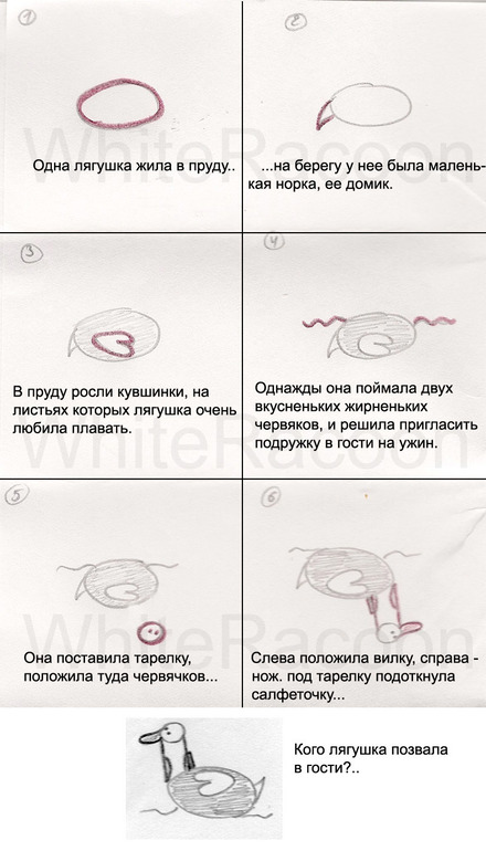 Про лягушку начало, понятно, что у нас все про лягушек =))) Можно заменить на любого другого более милого персонажа. Обмолвлюсь, что дочке с первого раза не понятно было. Что это утка. Так что, может, мой косяк, не знаю, попробуйте, потом расскажите, понятно ли детям, что это утка?.. Может, вилке и ножу не рисовать зубцов-лезвия, просто палками, будет понятнее?..