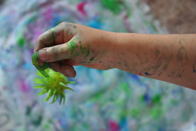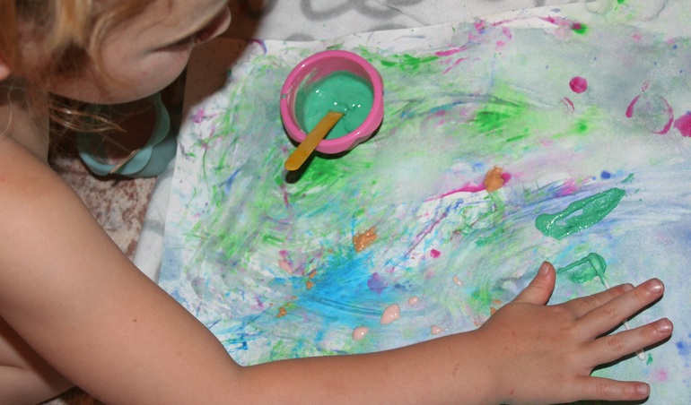 А когда полотно хорошенько просохло в ход пошли пухлые краски, с помощью которых мы создавали песок, водоросли и пену.