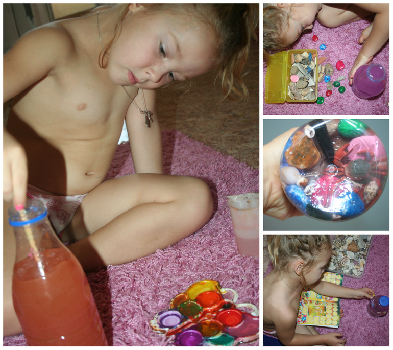 Камилке очень понравилось создавать вот такое мини-море. Она долго подбирала цвет, потом бросала камушки, ракушки, стеклышки... Резиновых животных мы тоже запустили в наше море, кто-то потонул, а кто-то остался парить на ниточках :-) Ну, и наклейки - самое любимое! В общем, увлеклись не на шутку :-)