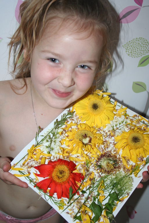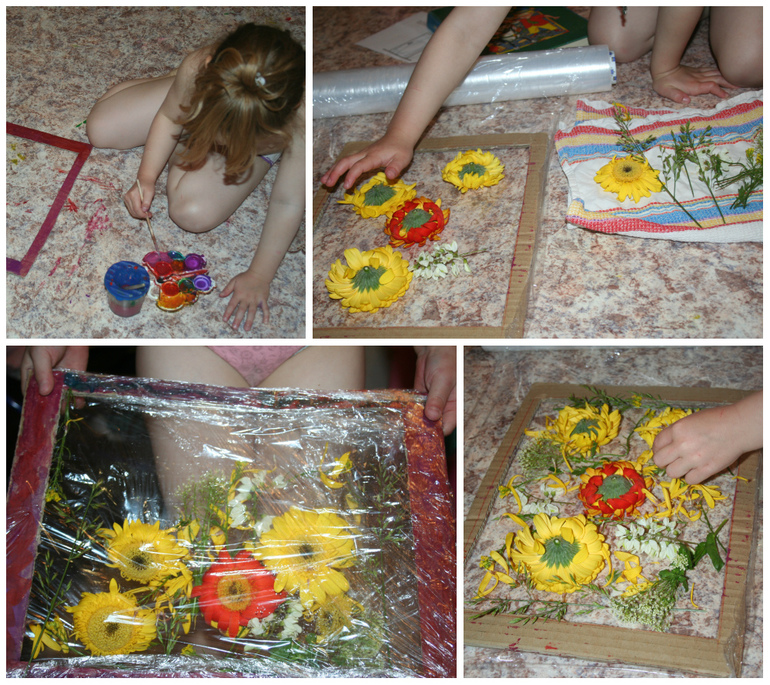 Правда, прежде чем создать вот эту красоту с помощью живых цветов и двухстороннего скотча, помучили их пытаясь сотворить новомодную картину при помощи картона и пищевой пленки. Ничего не вышло, цветы просто скатились вниз, но было интересно :-)