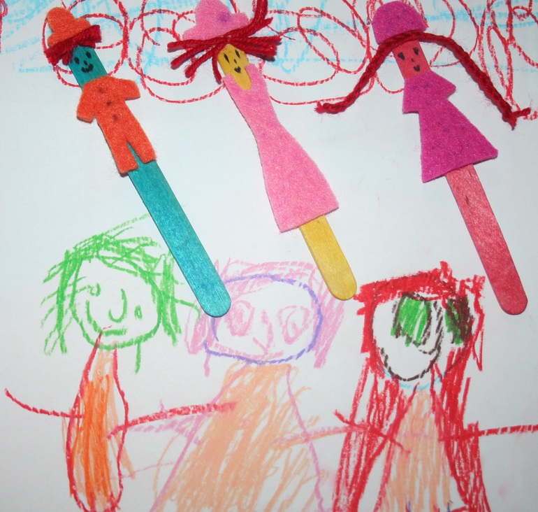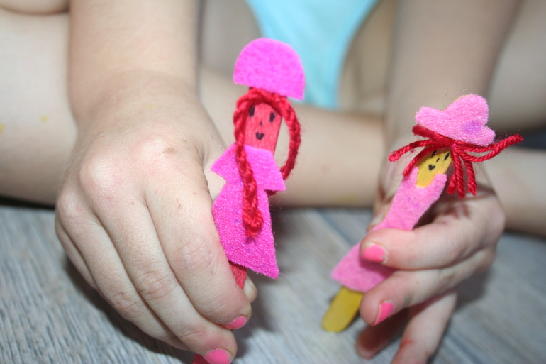 Делала я их для Камика в подарок. Фетр и нитки крепила на двухсторонний скотч (палочка моя выручалочка). Особых восторгов от Камика не ожидала, к таким вещам она относится спокойно, но вопреки моим "неожиданиям" человечки пользуются большой популярностью и сопровождают нас во всех ролевых играх. Думаю, теперь сделать еще русолочку и кошку с собакой, будем спектакли ставить :-)