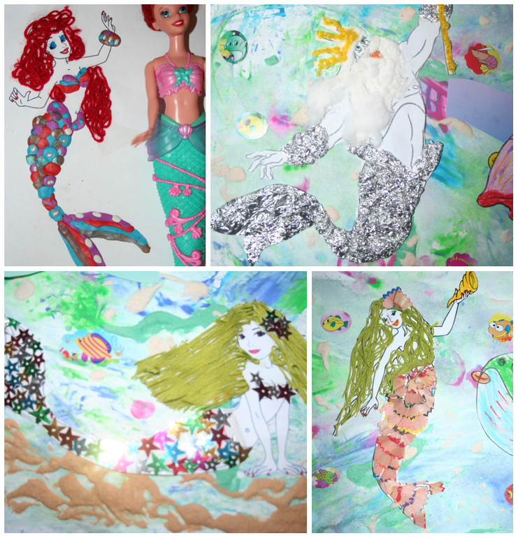 Ну, а дальше началось самое интересно - декор русалок :-) Ариэль у нас из пластилина и бусин, ее отец - царь Тритон из фольги и ваты, еще одна русалочка из звездочек, а последняя из карандашной стружки. Все детали крепили на шаблоны с помощью двухстороннего скотча, ну, и кое-где ПВА пригодился.