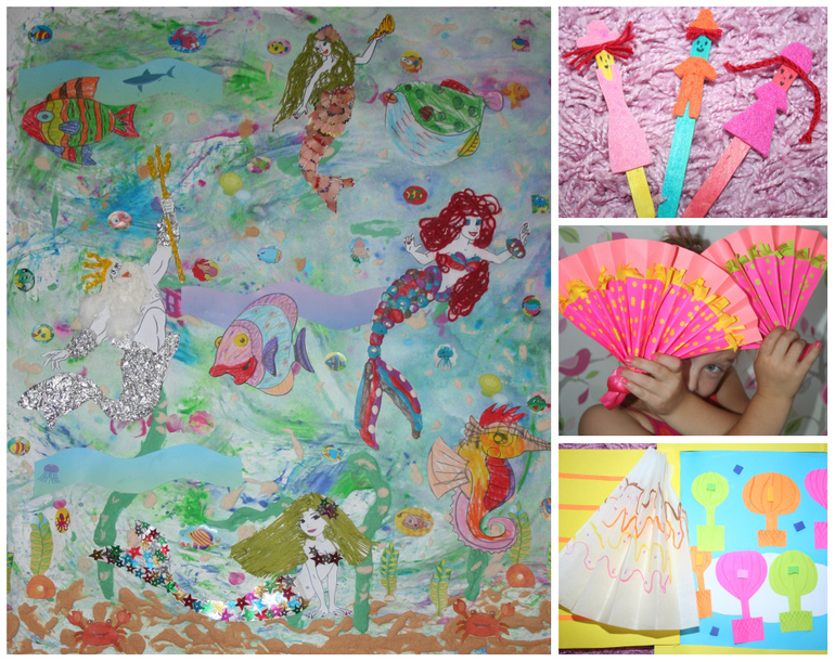 Чтобы русалочкам было нескучно заселили Атлантику разной живностью. Что-то вырезали из пройденных пособий, что-то из раскрасок, были и просто наклейки и даже волны из вырезалки Кумон. В общем, в итоге получилось вот так шумно, пестро, ярко, по-летнему!