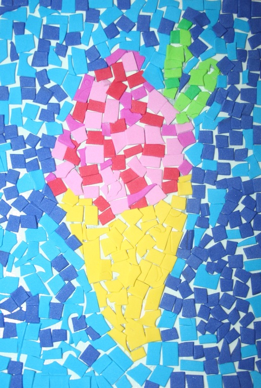 6. Продолжаем охлаждаться, и теперь уже обожаемым мороженным. Сделали картинку при помощи декоративной пенки в стиле мозаики. Подсмотрели идею здесь, а шикарные шаблоны нашли тут :-)