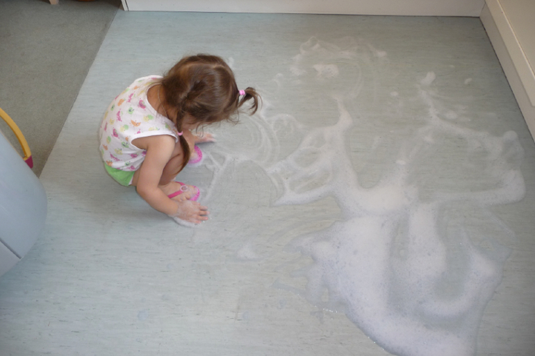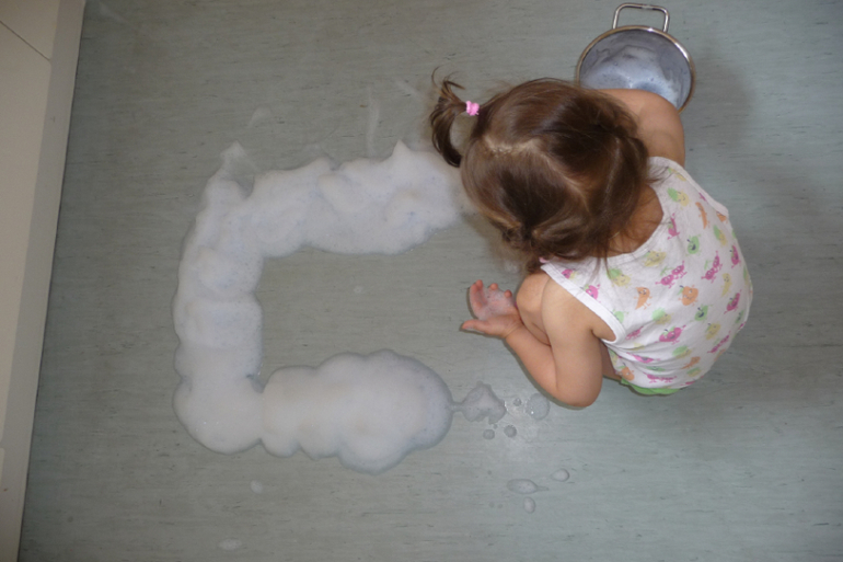 Рисовали на пене узоры, буквы. А потом мама мыла пол. Долго.......