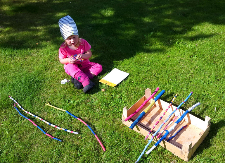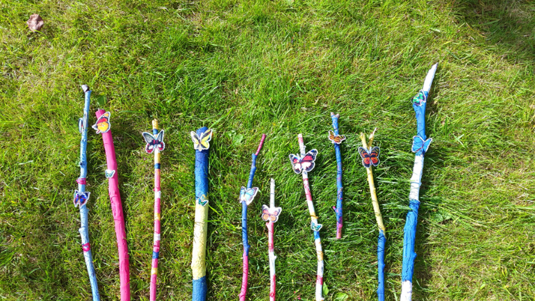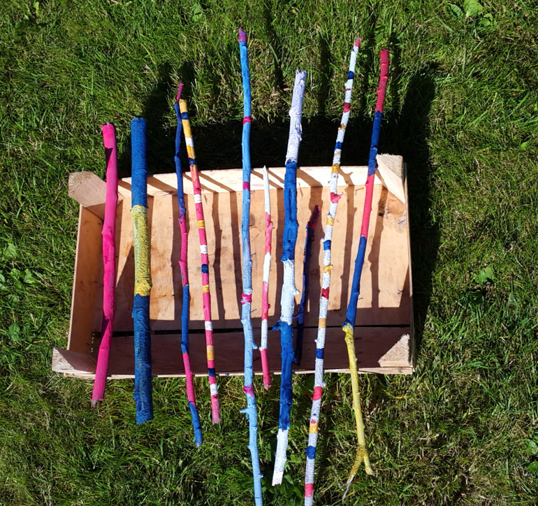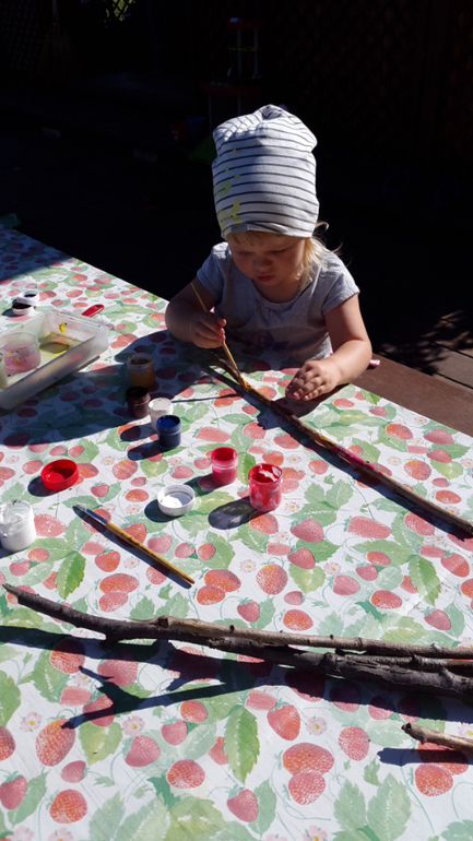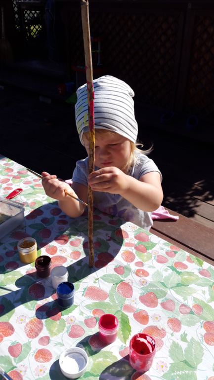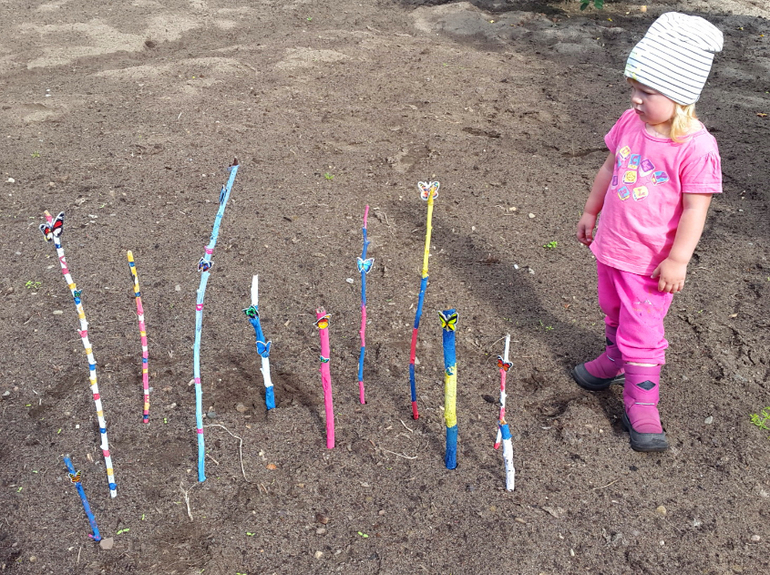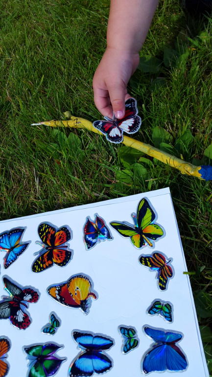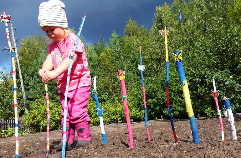 Мистер Умелец или Очумелые ручки (поделки, аппликации, интересные находки, идеи и задумки)Бумагу для рисования мы уже давно чем-то заменяем, то листиками от дерева, то капустными листами, а вот теперь набрали ворох веток и палок. Раскрасили гуашью, а ведь красить в объеме сложнее! Посадили на них бабочки-наклейки, и пошли втыкать в огород, где после выкопанной картошки, пустуют поля! Вот такой вот палка-арт получился!