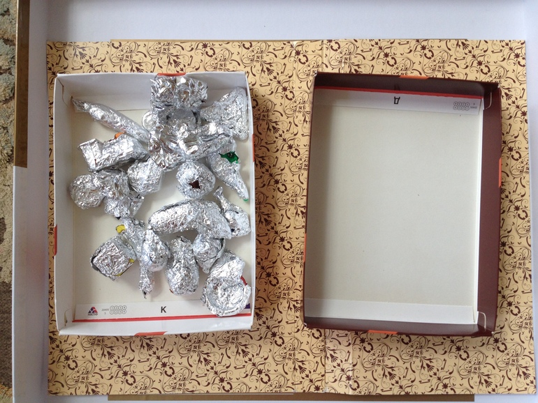 Здесь завернула разные по форме предметы (кубики, мелочевка фикс-прайса, фигурки резиновые, шарики, фигурные скрепки), предварительно пыталась попросить ребенка определить на ощупь, что же там спряталось, не всегда он хотел угадывать;-), иногда молча разворачивал:-)