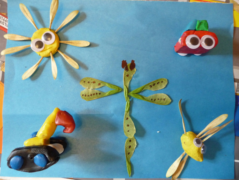 Пока Алиса спала, мы с Ромкой успели поесть Лапшу, слепить Луну, на которую приземлился собранный из Лего Луноход и сделать аппликацию из сухих Листьев. Я сделала божью коровку, а Ромка паучка и скорпиона.