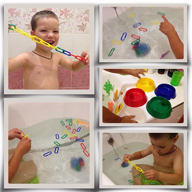 Игры для развития речи ( все о развитии мелкой моторике, логопедических играх, пальчиковых играх, скОсобенно там, где ее не ждешь;-) Так между делом осваиваем и закрепляем понятия "меньше", "больше", "столько же" и т.п. А в сочетании с любимым купанием получается настоящая гремучая смесь из познавательного интереса и положительных эмоций! Суперигрушки в деле, на фото представлены цветные скрепки;-)