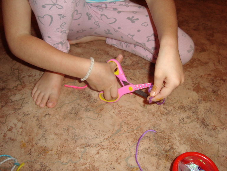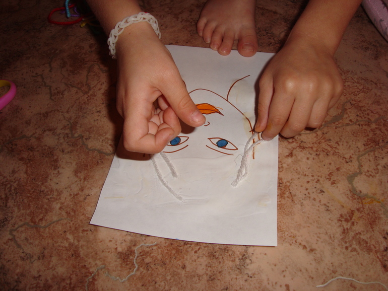 Для следующей прически режем нитки и наклеиваем в произвольном порядке.