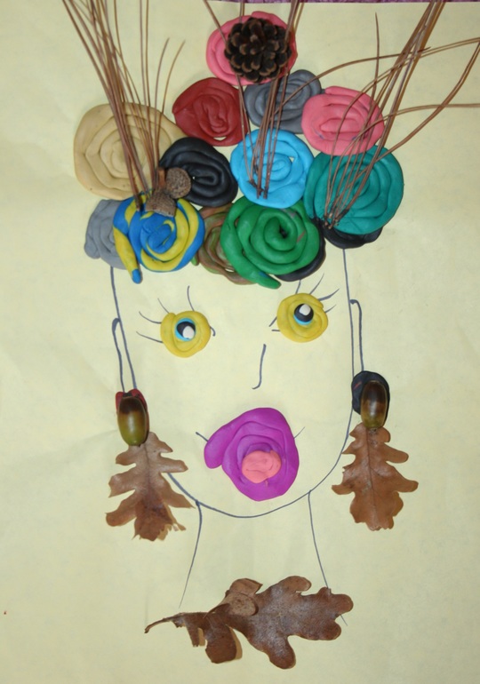 Прическу делаем из пластилина и обязательно заколочки из пайеток для завершенного образа.