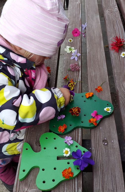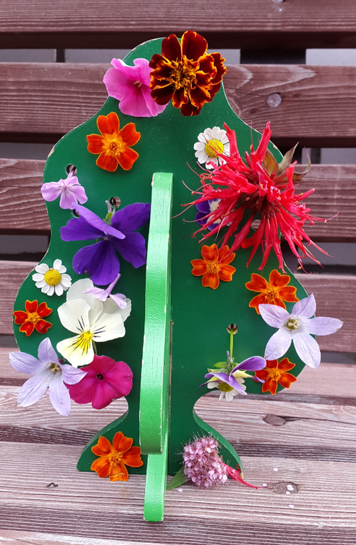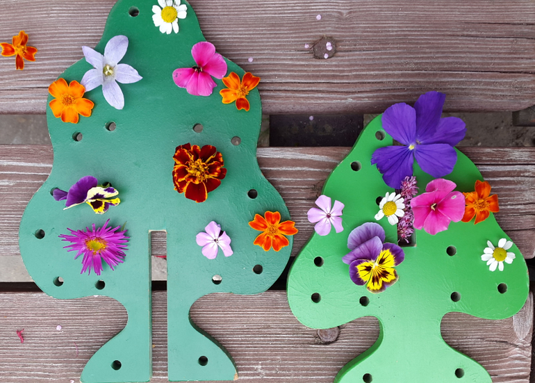 Мистер Умелец или Очумелые ручки (поделки, аппликации, интересные находки, идеи и задумки)Как-то давно нам подарили деревянный набор - два деревца с дырками, в которые нужно вдевать шнурок и украшать фруктами и цветами! Занятие нудное и даже взрослому очень кропотливое. Стояли эти вещи без дела, а тут пришла мысль украсить их настоящими цветами. Легко, быстро, красиво, настоящий флёр пазл получился! Придумывайте новую жизнь старым вещам!