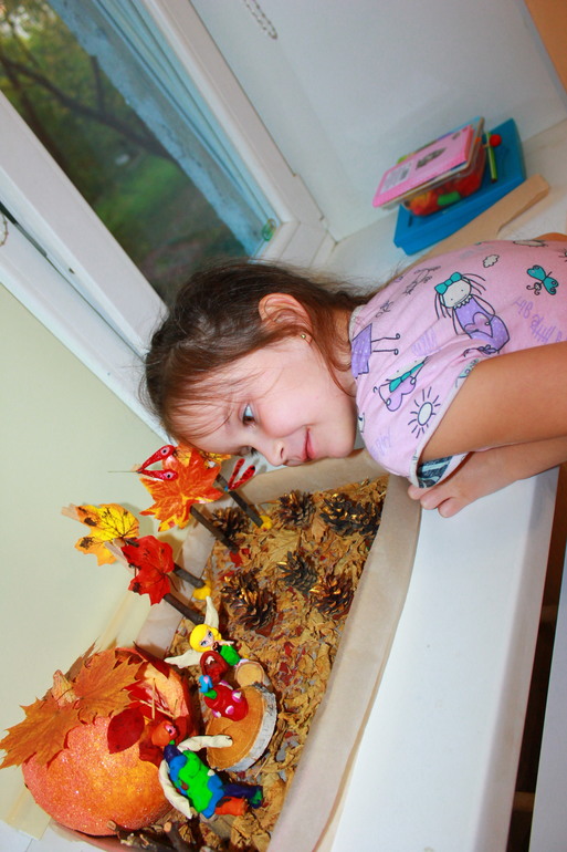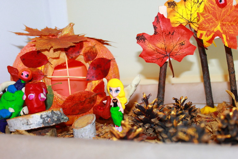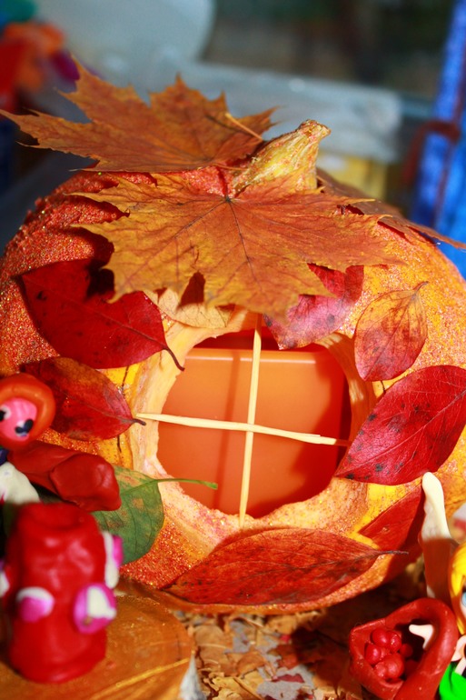 Домик для фей дочь делала. Кривенько, но САМА (разумеется кроме вырезания окна и выскребания тыквы изнутри)