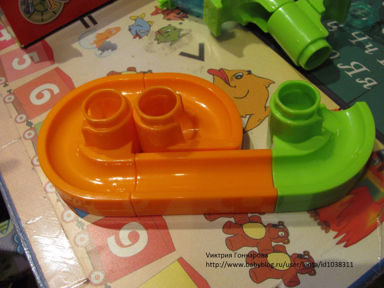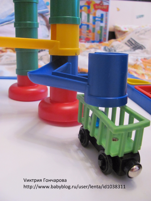 "Веселые горки" от фирмы Бауэр 51 деталь (здесь 65 деталей). Дарила на 3 года. Сначала особого эффекта не вызвал. Недавно только начал им, не скажу что увлекаться, но проявлять интерес.