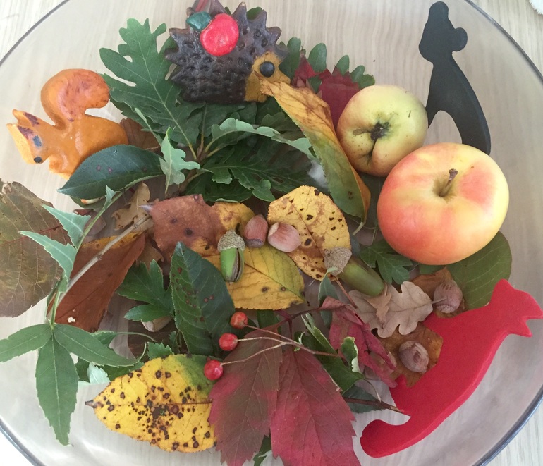 помогали белке готовить на зиму припасы, укладывали ежа спать под листвой, сравнивали белку и ежа и сам Миша был ежом ). А потом полакомились гостинцами осени и съели яблоки и орешки.