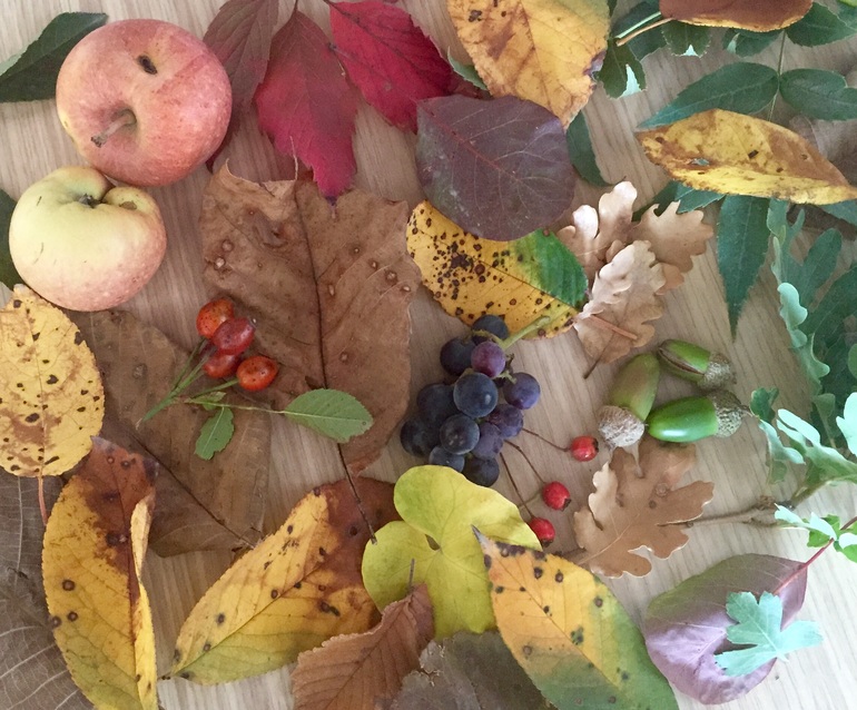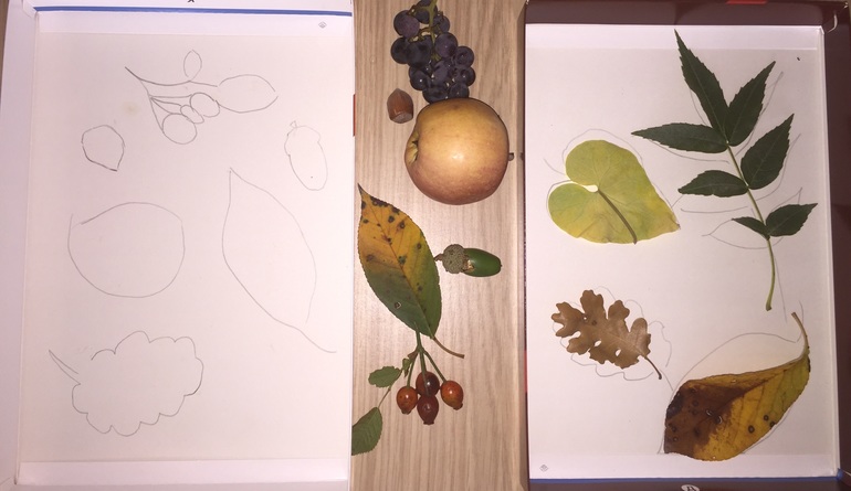 Начали мы с обсуждения изменений в природе. Беседу провели на улице, качаясь на качели наблюдали кружение листьев, шуршали листьями под ногами, говорили о птицах перелетных и наших постоянных соседях - воробьях, вспоминали как и чем мы их подкармливали зимой. А еще сходили на охоту за дарами осени. Такая формулировка нашего собирательства очень вдохновила Мишу и он долго, с неподдельным интересом отыскивал листья разных оттенков и плоды.
