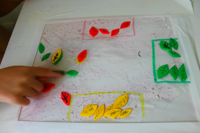 Можно сделать другие задания- разложить листья по размеру (от большего к меньшему и наоборот), можно вместо "ворот" нарисовать кружки ("пакетики")для каждого листочка и разложить их по "пакетикам", можно в "воротах" писать определенное кол-во и раскладывать листья по счету , можно , в конце концов нарисовать дерево и "прилепить" листья к веточкам. Благодаря гелю листики легко скользят внутри файла. Это вам и моторика и счет и грамматика (если придумать другие задания) и минут 20 свободного времени.