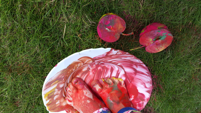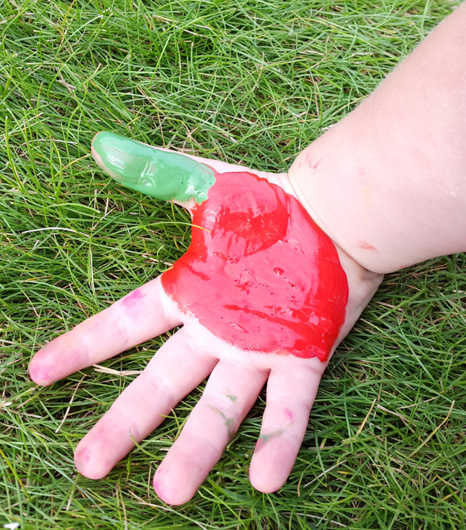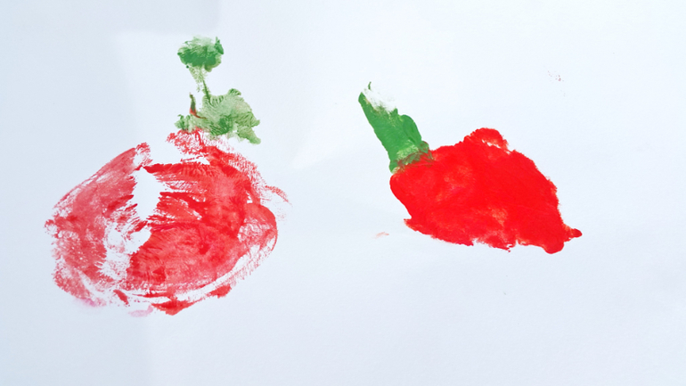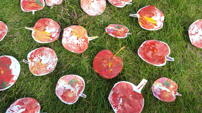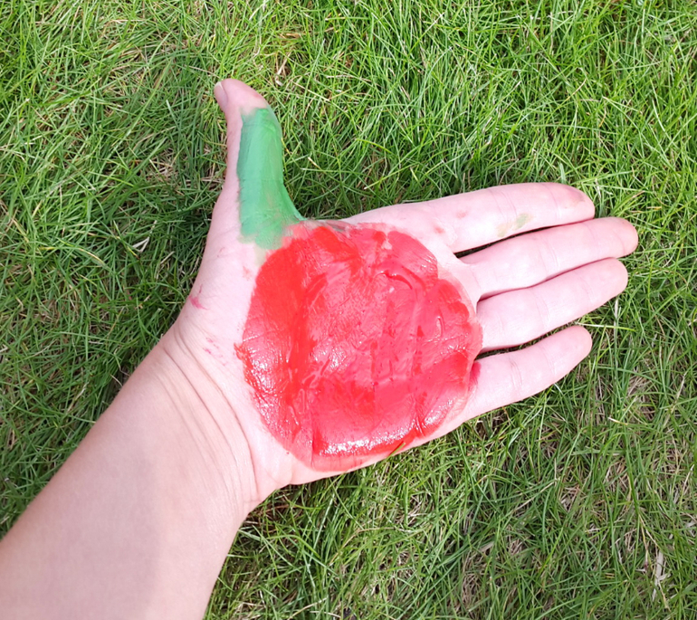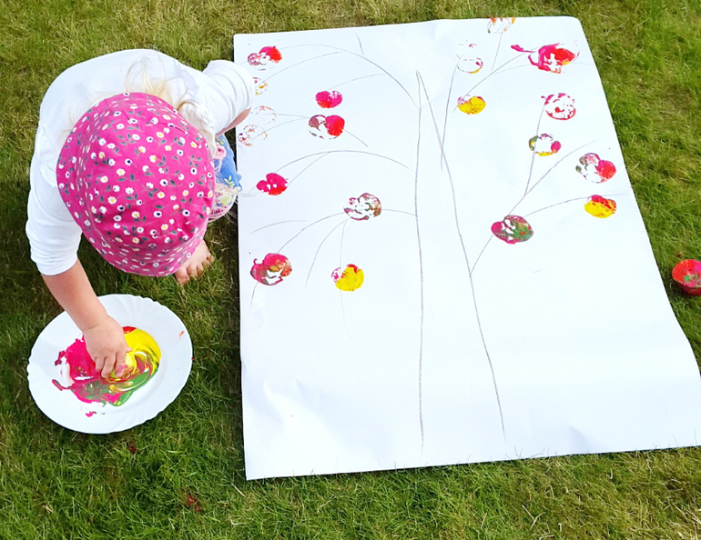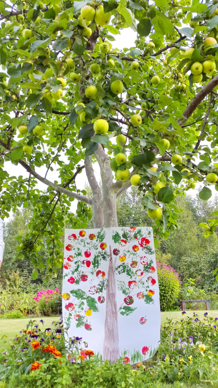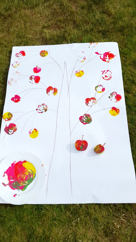 Работали часа 2 без останвоки, Маша иногда убегала в огород,, чтобы подкрепиться горохом, но по итогу у нас теперь на даче на стене висит огромная яблоня на ватмане, венок из яблочных штампов, и еще мы освоили метод рисования яблок ладошкой! Про яблочные чашки я писала отдельно тут