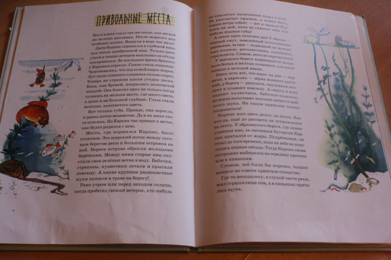 Если "Карпик" ориентирован на аудиторию от 7, там и оформление соответствующее, страничке мелованные тонкие, но обложка твердая. Вообще книга для тех, кто любит слушать про жизнь животного мира.