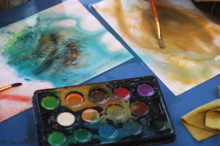 Рисовали планеты акварелью с солью. Брали тарелку, обводили по контуру и раскрашивали.