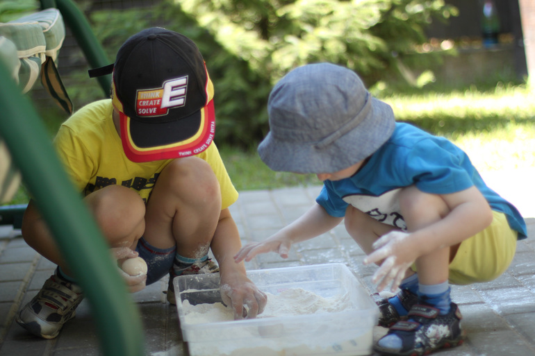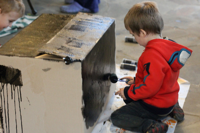 В который раз убеждаюсь, что такие коробки невероятно интересны детям любых возрастов. Мальчики очень-очень надолго увлеклись игрой с коробкой. Там же они нашли деревянные заготовки звезд, которые поспешили украсить.