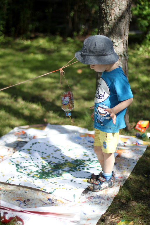 Дети, читая космические книги, требовали заданий еще и еще. Тогда мы сотворили вот такую галактику (бутылка с краской превратилась в маятник и,раскачиваясь, капала на ватман вот таким узором).