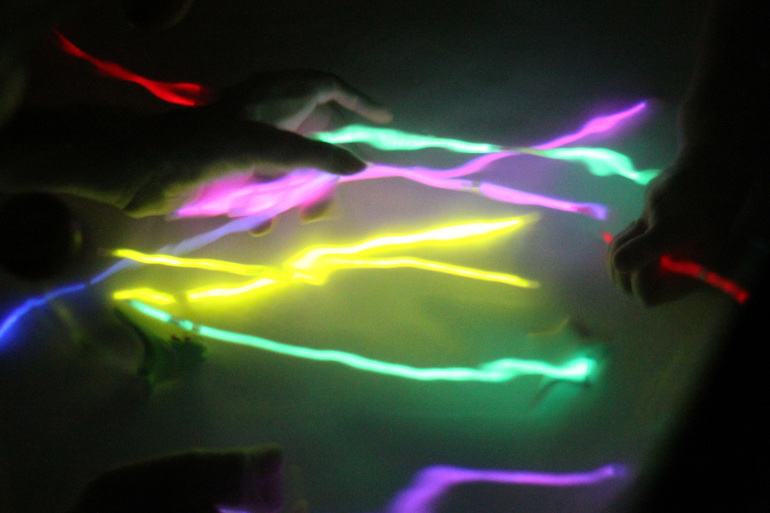 А вечером мы устроили космическую ванную. Вода + светящиеся палочки + флуоресцентные звездочки и планеты + отсутствие света… это было так красиво! Дети до сих пор вспоминают и просят повторить!