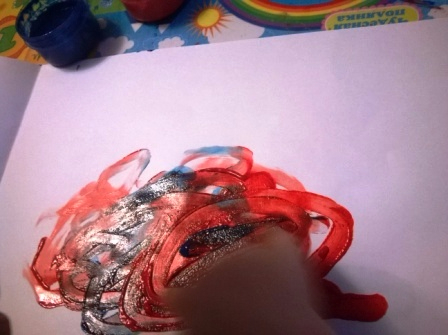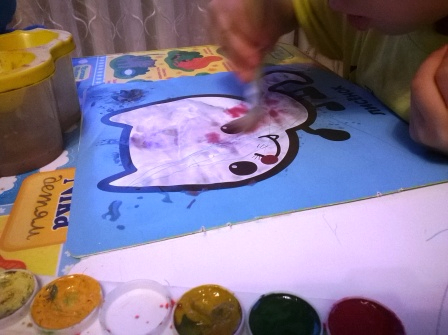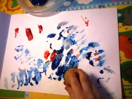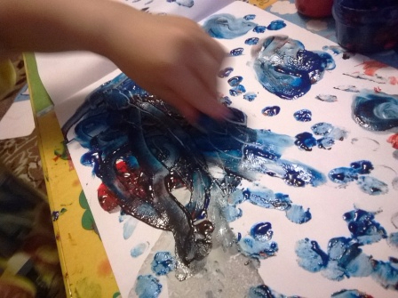 Когда надоело, мы приступили к следующему способу. Рисовали пальчиками. Это не первый наш опыт, но рисуем так редко, т.к. после мне приходиться отмывать не только сына, но и все вокруг в том числе и себя. Но рисовать так сын может очень долго, пол альбома точно было использовано под шедевры.
