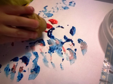 Рисовали штампами из овощей. Идею я подсмотрела тут . Я сделала самые простые из картофеля и морковки. Этот способ довольно интересен, получаются необычные узоры и следы.
