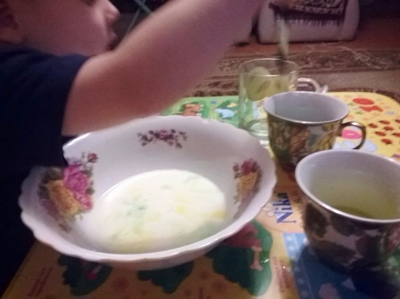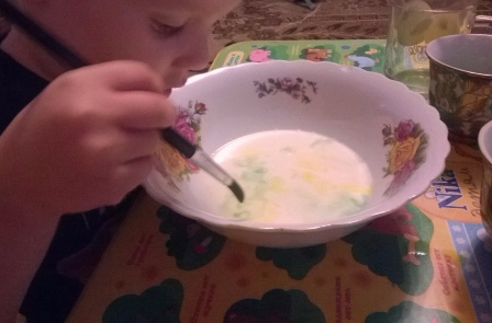 И самым завершающим, но наверно и самым интересным для меня, было рисование на молоке. Идею взяла тут тут Суть заключается в том, что нужно капать в молоко краской, а потом жидким мылом и получаются причудливые узоры, сын не совсем понял идею, и ему быстро надоело, да он и устал, а вот мне понравилось. Думаю деткам постарше будет очень увлекательно, только берите краски по ярче.