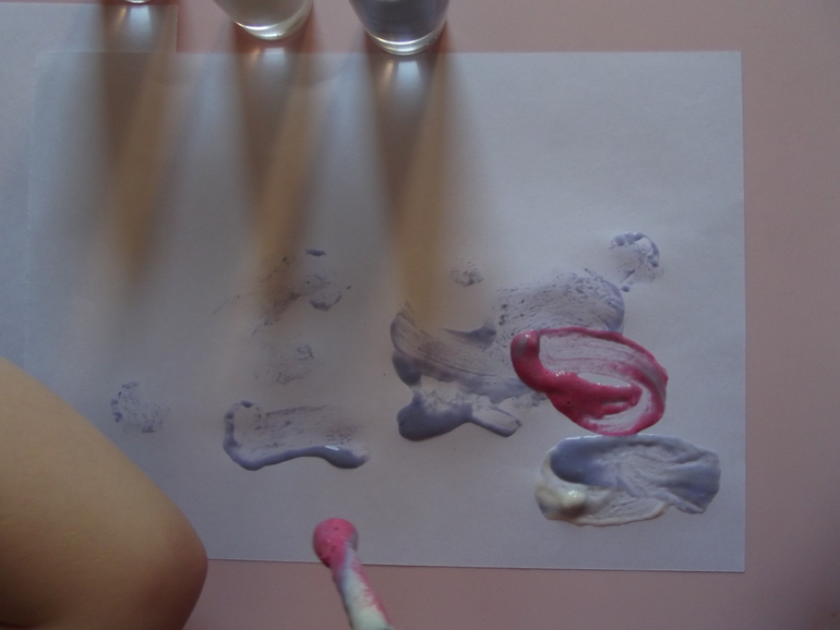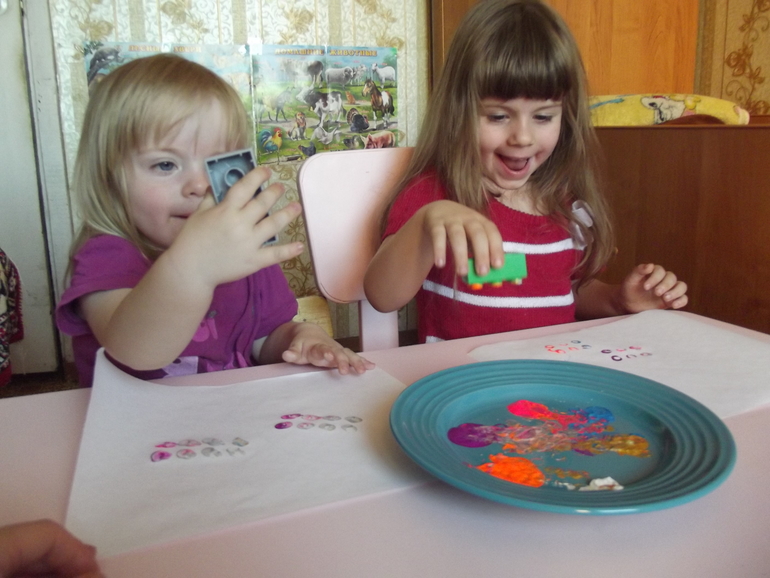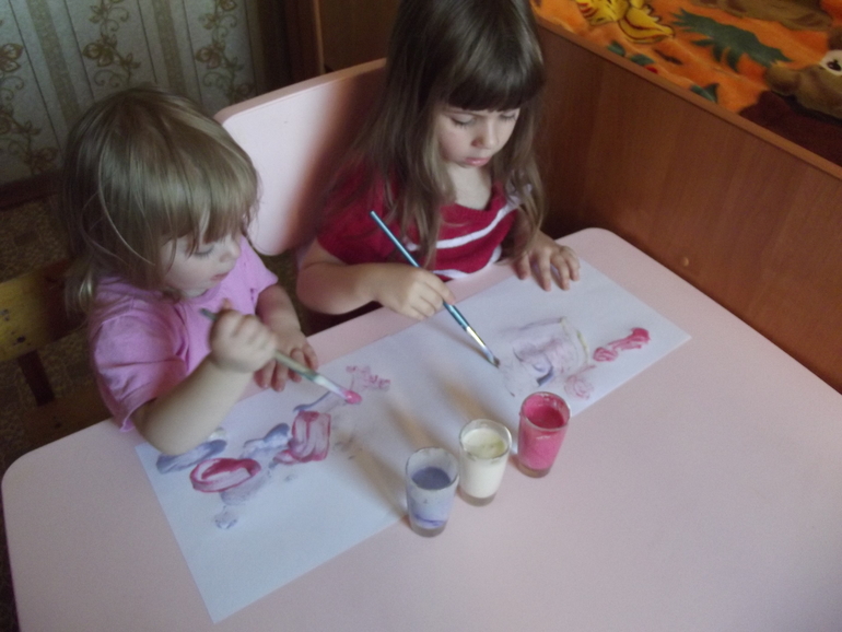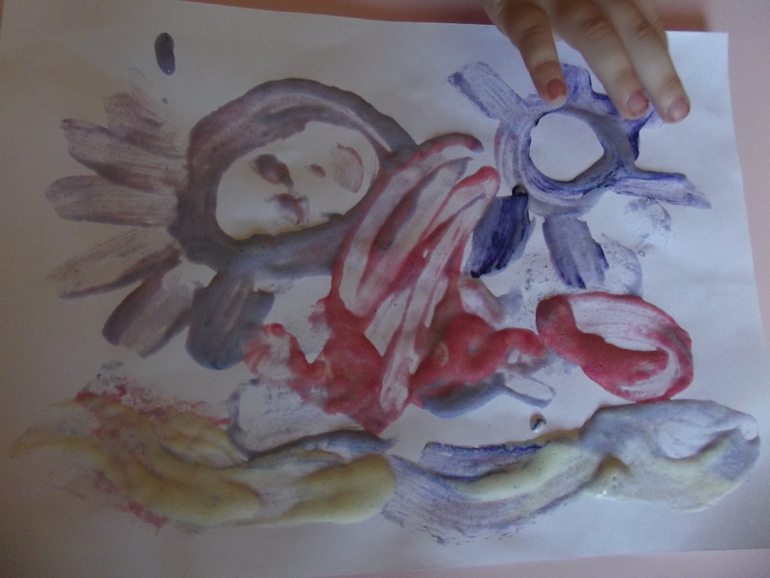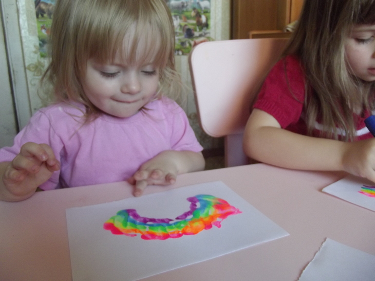 Отпечатки радуги.Я нарисовала радугу на одном листе,дети отпечатывали рисунок на другие.Правда синий цвет у нас закончился,дорисовывали маркером.))