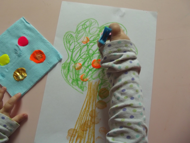 Украшали дерево листьями с помощью помпона.Можно использовать любой другой штамп.