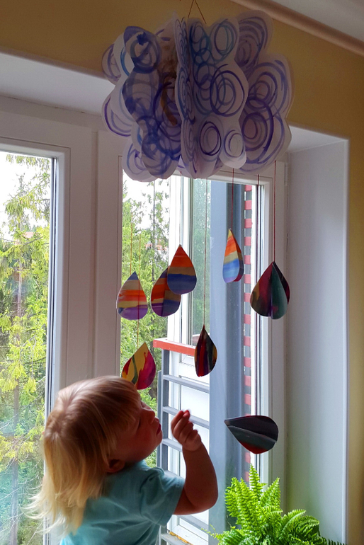 Мистер Умелец или Очумелые ручки (поделки, аппликации, интересные находки, идеи и задумки)На улице часто дождик, и мы решили сделать свое плакучее облачко! Подготовили цветные листы с радужной покраской, вырезали капли, облако, склеили все двухсторонним скотчем! Висит эта красота на окне и радует глаз!