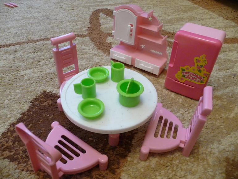 В наборе был еще и буфет, а стола со стульями не было. Обеденная группа (стол, 2 стула, 2 кружки, 2 тарелки, кастрюля) продается отдельно. Подошел и холодильник из другого набора.