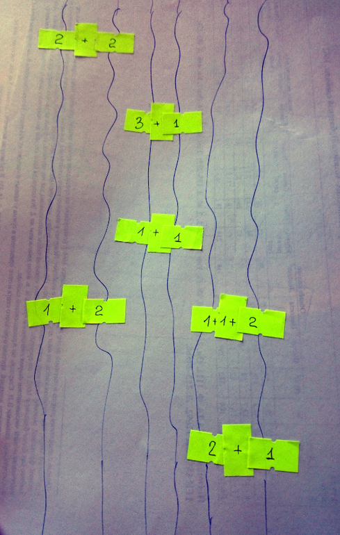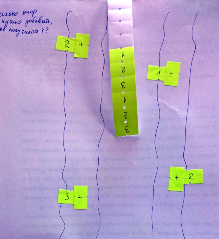 Сначала коту пришлось добавить опор к мостам, чтобы все могли проехать. Тут, на самом деле, я ошиблась, из-за того, что Фелька застал меня врасплох - сначала нужно было дать другое задание на опоры. А тут оказалось слоооожно. В уме Фелька вполне запросто решает такие примерчики, но вот когда воображаемые предметы заменились значками цифр, он встал в ступор, пришлось каждый раз проговаривать: 2 - "представь себе два яблока" и т.д. В общем, справился, но с явным напряжением умственных сил.