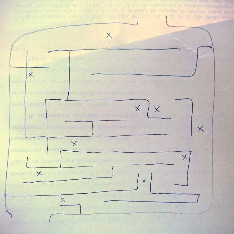 Тут кот проголодался и быстро-быстро пробежался по замку - поохотился за мышами. Лабиринт срисовала из книжки "". Сам пока всё-таки не отслеживает условие не проходить по одному месту два раза, но с напоминанием справляется.