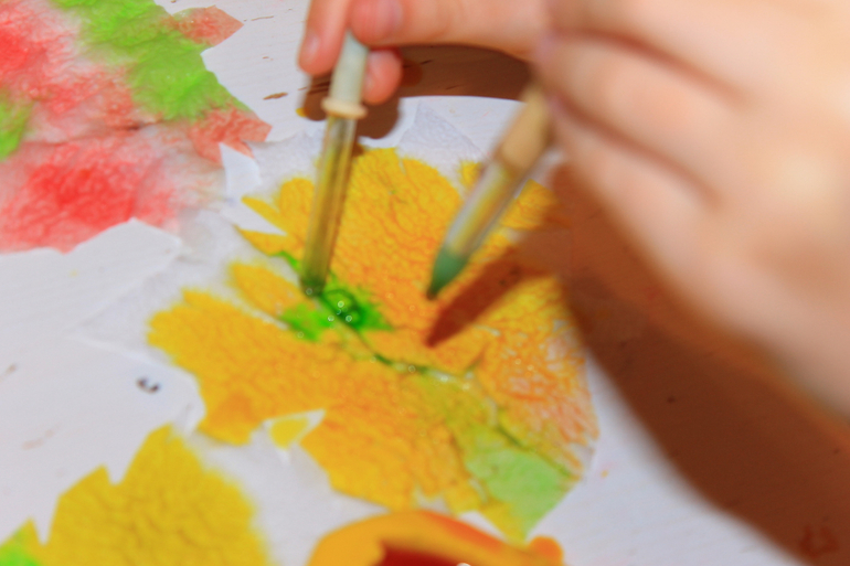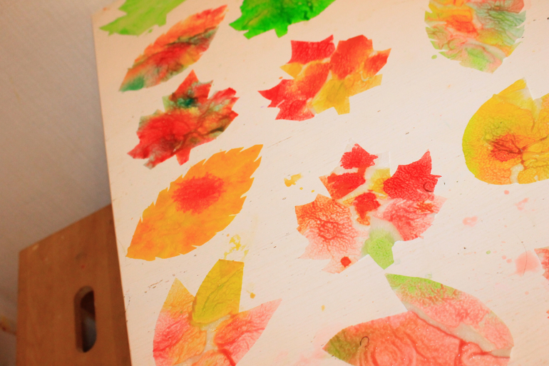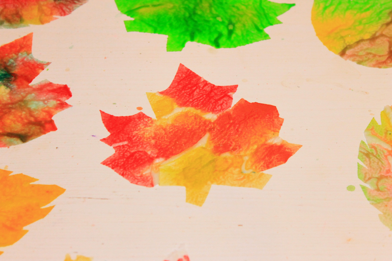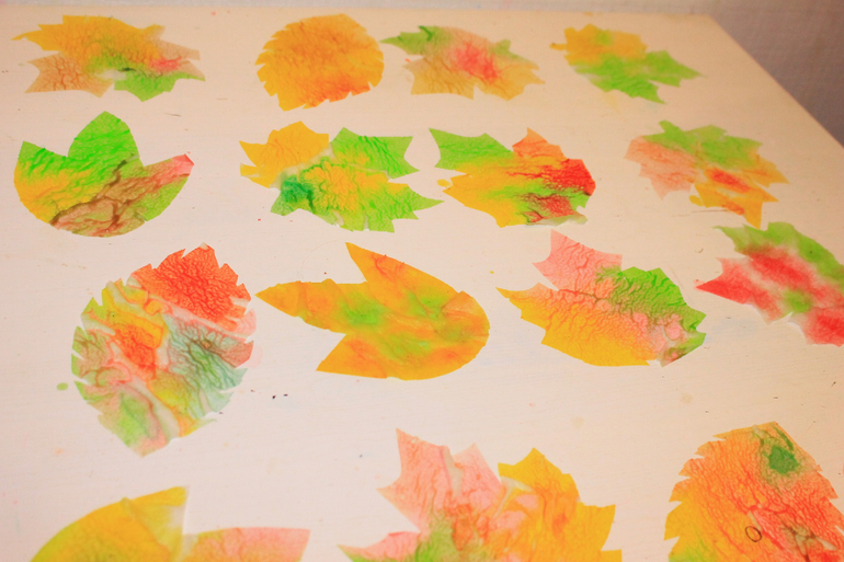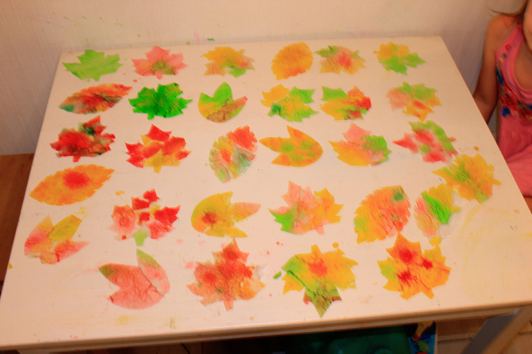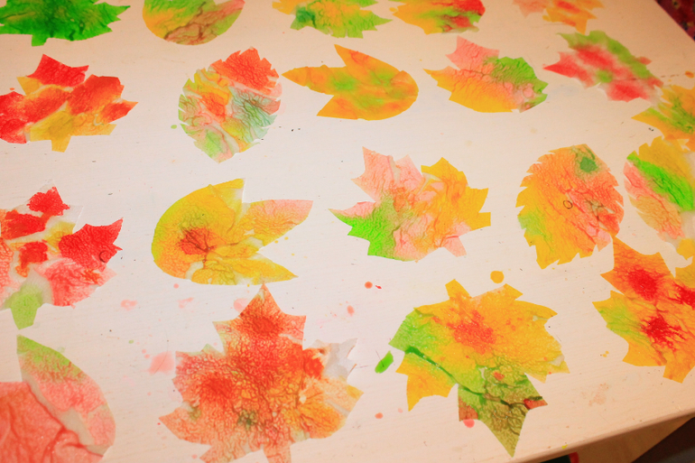 Из обычных салфеток вырезаются разной формы листочки. Что удобно,это можно сделать "оптом".А потом краски, сильно замешанные с водой,пипетка и понеслаааась